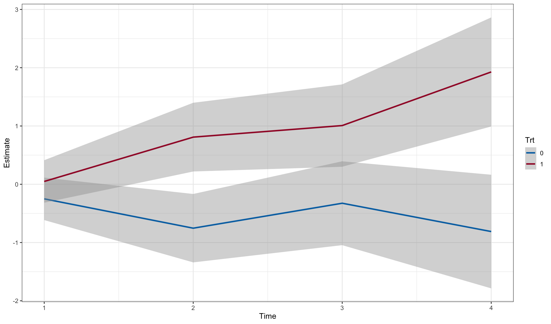 ggplot(newdat, aes(y=Estimate, x=Time, color = Trt)) +